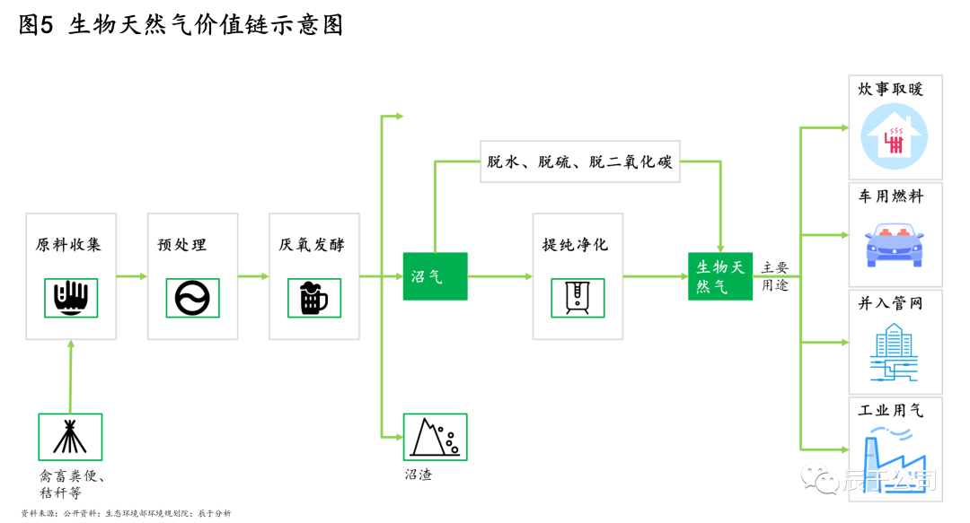 生物天然氣是指通過對秸稈、人畜糞便等生物質(zhì)經(jīng)過發(fā)酵形成沼氣后,進(jìn)一步提純獲得的天然氣,作為天然氣的替代品用于家庭炊事取暖、車用燃料、工業(yè)用氣等領(lǐng)域,它的價值鏈較長(見圖5)。