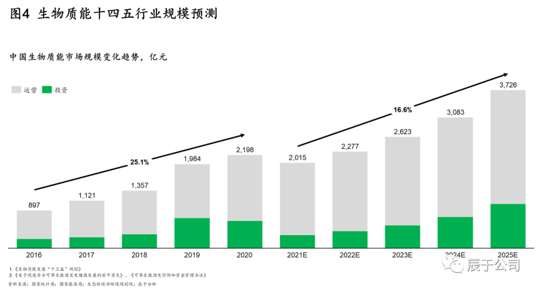 辰于預(yù)測,隨著“30·60”雙碳目標(biāo)引導(dǎo)下的能源革命和能源轉(zhuǎn)型,以及相關(guān)政策支持(例如明確對存量、增量的生物質(zhì)發(fā)電項目將按照新增不欠的原則由國家繼續(xù)給予電價補(bǔ)貼,并鼓勵金融機(jī)構(gòu)按照市場化原則對列入補(bǔ)助項目清單的企業(yè)予以支持),生物質(zhì)能市場“十四五”期間的投資和運(yùn)營規(guī)模將持續(xù)提升,復(fù)合增長率16.6%,到2025年達(dá)到3700億元規(guī)模(見圖4)。投資方面,預(yù)計生物天然氣投資額最高,增長也最快;運(yùn)營方面,生物質(zhì)發(fā)電占比最高,但生物天然氣的增速最快。