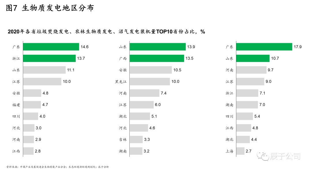 在地區(qū)分布上,各類型的生物質(zhì)發(fā)電集中于華東華南地區(qū),但各地區(qū)側(cè)重點有所不同。截至2020年底,垃圾焚燒發(fā)電集中在廣東省、浙江省、山東省、江蘇省、安徽省等地區(qū),合計占全國累計裝機(jī)容量的54%;農(nóng)林生物質(zhì)發(fā)電主要集中于山東省、湖北省、安徽省、黑龍江省、河南省,合計占比達(dá)到55.3%;沼氣發(fā)電主要集中于廣東省、山東省、河南省、江蘇省、浙江省,合計占比達(dá)到54.3%(見圖7)。