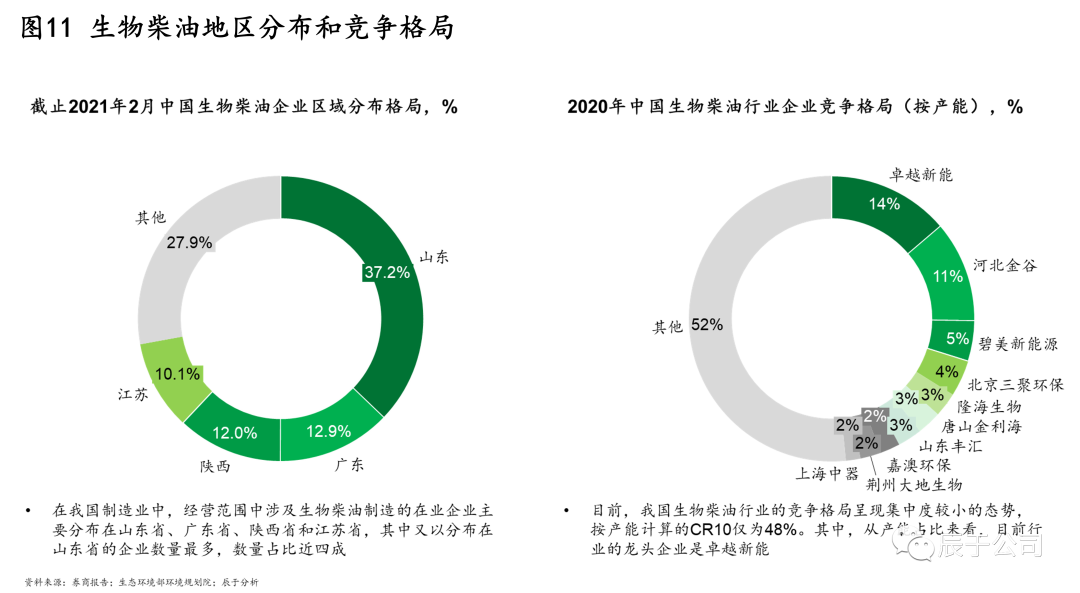 在銷售應(yīng)用上,國內(nèi)的主要渠道是出口、交通燃料、化工等,出口是拉動行業(yè)發(fā)展的主要渠道,2019年出口占產(chǎn)量的比例達(dá)到80%。國內(nèi)需求的打開是行業(yè)發(fā)展的最大希冀,其中最有望打開的市場是交通燃料領(lǐng)域——生物柴油強(qiáng)制添加政策。部分城市已經(jīng)開始在試點,上海市2013年開始在公交車上實行B5標(biāo)準(zhǔn)(添加比例5%)?,F(xiàn)在國家已開始全國范圍進(jìn)行B5 強(qiáng)制添加標(biāo)準(zhǔn)的意見征求,并有望隨著雙碳目標(biāo)深入推進(jìn)提升到B10。若政策落地實施,將產(chǎn)生450萬噸~1000萬噸的產(chǎn)能缺口。