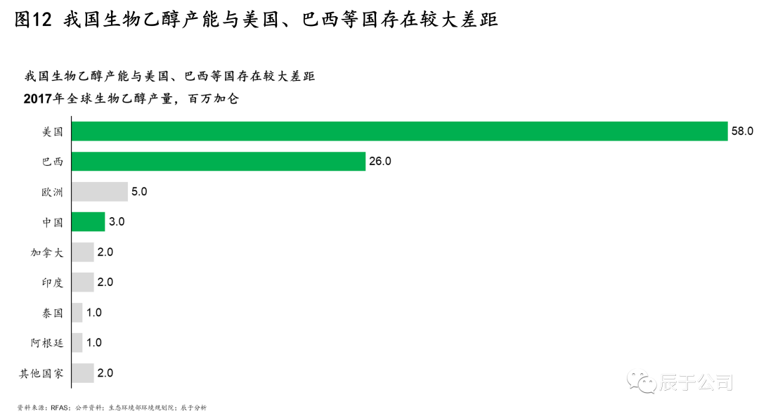 我國發(fā)展生物乙醇的總思路是“核準(zhǔn)生產(chǎn)、定向流通、封閉運(yùn)行、有序發(fā)展”,生物乙醇的生產(chǎn)、流通、銷售等都在嚴(yán)格限制范圍內(nèi)進(jìn)行,目標(biāo)到2025年達(dá)到688萬噸產(chǎn)量(2020年400萬噸)。但這一數(shù)字與美國、巴西等國家相比差距較遠(yuǎn),2017年全球生物乙醇產(chǎn)量中,中國的產(chǎn)量只有美國的二十分之一(見圖12)。