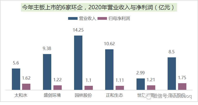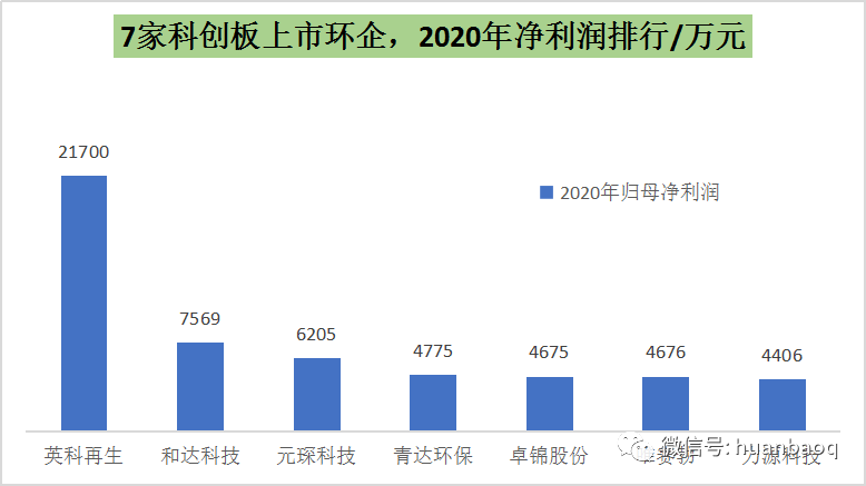 接下來(lái),再說(shuō)說(shuō)大家比較關(guān)心的,今年上市企業(yè)的股價(jià)漲幅、最新市值和盈利水平。我們選擇主板、創(chuàng)業(yè)板、科創(chuàng)板上市的企業(yè)分別進(jìn)行對(duì)比。今年在主板上市的共有7家企業(yè),分別為太和水、園林股份、海天股份、盛劍環(huán)境、世茂能源、正和生態(tài)和宇通重工,由于宇通重工是通過(guò)大股東摘帽變更方式上市而來(lái),暫且不對(duì)其進(jìn)行評(píng)價(jià)。剩下6家企業(yè)中,根據(jù)10月14日的收盤(pán)價(jià),太和水和園林股份竟然跌破發(fā)行價(jià),尤其是太和水,從發(fā)行價(jià)的43.3元/股跌至34.91元/股,總市值蒸發(fā)了近14億元。而同為主板上市的盛劍環(huán)境則表現(xiàn)極佳,這家從事半導(dǎo)體廢氣治理、煙氣凈化的公司,在國(guó)內(nèi)半導(dǎo)體產(chǎn)業(yè)大發(fā)展背景下,股價(jià)從19.87元/股漲至56.73元/股,總市值升至70.3億元,成為今年主板上市市值最高環(huán)保企業(yè)。這6家主板上市環(huán)企,2020實(shí)現(xiàn)營(yíng)業(yè)收入大多位于5億元-14億元之間,歸母凈利潤(rùn)也大多在1億元-2億元,營(yíng)收最高的是杭州園林股份的14.25億元,凈利最高的則是成都海天股份的1.75億元。自上市以來(lái),海天股份動(dòng)作頻頻,半年前還收購(gòu)了新開(kāi)元等4座污水廠(chǎng),然后又?jǐn)M與康恒合資開(kāi)公司,開(kāi)拓四川垃圾焚燒/固廢業(yè)務(wù)。▼圖七:6家主板上市環(huán)企,2020年?duì)I收與凈利潤(rùn)相對(duì)于主板上市企業(yè)的表現(xiàn)平平,今年10家在創(chuàng)業(yè)板上市的環(huán)企,股價(jià)清一色迎來(lái)大增,從8元-9元小盤(pán)股漲至20元-40元的中小型股,大多翻了2倍,或許跟創(chuàng)業(yè)板估值起飛有關(guān)。其中,百川暢銀(垃圾填埋氣發(fā)電)和倍杰特(高鹽度工業(yè)廢水治理)值得一說(shuō),不是由于股價(jià)翻了幾翻,而是在于它們卓越的賺錢(qián)能力。相較于其他上市環(huán)企的幾千萬(wàn)凈利,去年在飽受疫情沖擊的情況下,這兩家企業(yè)的凈利潤(rùn)竟然都過(guò)了億,比老牌上市企業(yè)盈利能力還要強(qiáng)。▼圖八:10家創(chuàng)業(yè)板上市環(huán)企,2020年凈利潤(rùn)排行接著,我們?cè)倏纯苿?chuàng)板,相對(duì)于去年的11家,今年科創(chuàng)板上市的環(huán)企只有7家,分別是英科再生、和達(dá)科技、青達(dá)環(huán)保、力源科技、卓錦股份、元琛科技、唯賽勃。這7家企業(yè),除了英科再生(塑料回收再生)2020年歸母凈利潤(rùn)遙遙領(lǐng)先之外,其余幾家凈利潤(rùn)都在幾千萬(wàn)左右。值得一提的是膜企唯賽勃,去年?duì)I收和凈利潤(rùn)雙雙下滑,其中凈利潤(rùn)下滑30%至4674萬(wàn)元,這也從側(cè)面說(shuō)明了科創(chuàng)板企業(yè)過(guò)會(huì)門(mén)檻相對(duì)較低。▼圖九:7家科創(chuàng)板上市環(huán)企,2020年凈利潤(rùn)排行