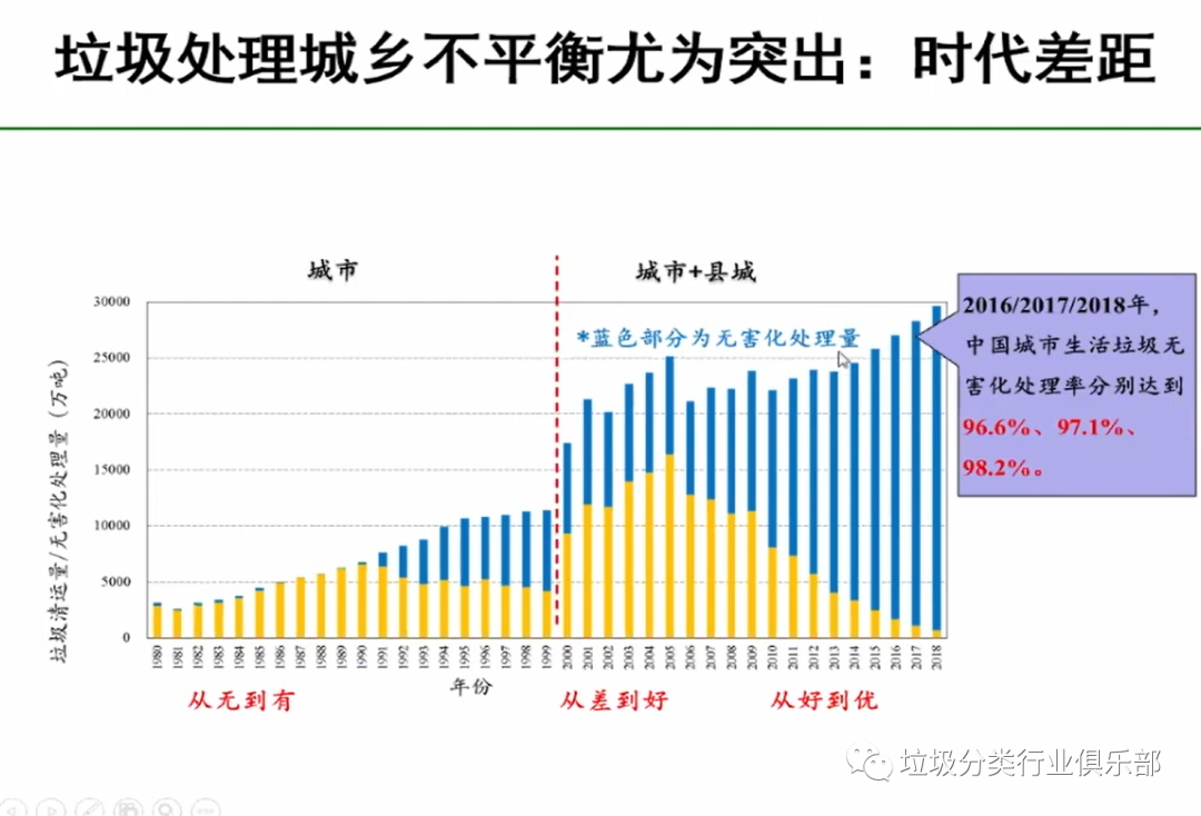 當(dāng)前城市的垃圾處理基本問(wèn)題已解決,現(xiàn)在要在分類的新的理念引領(lǐng)下,我們向著可以構(gòu)建新型模式,但是我們大的無(wú)害化處理這些問(wèn)題已基本得到解決。2018年垃圾的垃圾無(wú)害化處理已經(jīng)達(dá)到了98.2%,而農(nóng)村連基本數(shù)據(jù)都沒(méi)有,農(nóng)村的數(shù)據(jù)很多都是估計(jì)的?,F(xiàn)代化的管理是數(shù)字化的管理、信息化的管理,沒(méi)有數(shù)字就表明對(duì)它是沒(méi)有管理。底數(shù)不清,說(shuō)明對(duì)它的管理薄弱。