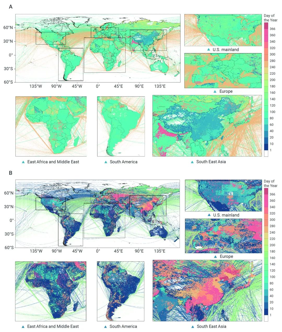 GRACED反映了全球不同區(qū)域受疫情影響排放大幅下降時(shí)間和后期經(jīng)濟(jì)復(fù)蘇排放顯著反彈時(shí)間的差異(圖6)。圖6A展示了全球不同區(qū)域最大碳排放降幅日的碳地圖,圖6B展示了最大反彈日的碳地圖。顏色越紅表明出現(xiàn)時(shí)間越晚。