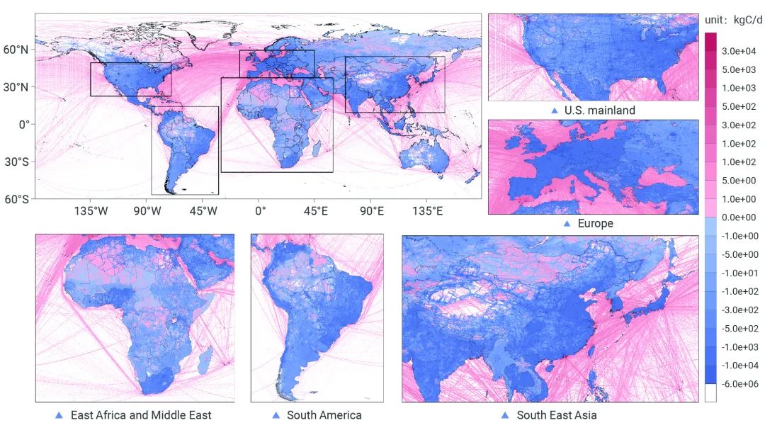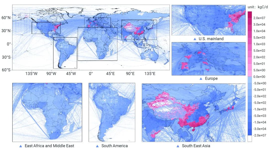 ▲圖4展示了2020年全球網(wǎng)格級(jí)周末排放與工作日排放日度差異(周末減工作日)