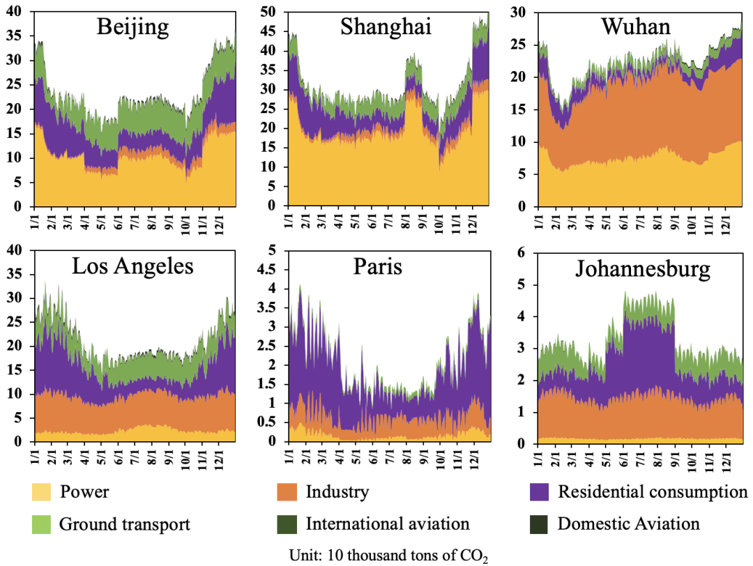 GRACED覆蓋了全球重點(diǎn)城市在內(nèi)的關(guān)鍵排放區(qū)域,并量化表征分部門排放的時(shí)空動(dòng)態(tài)特征。數(shù)據(jù)顯示,2020年中國(guó)的北京、上海、武漢城市的碳排放量在1月末首先受疫情沖擊,出現(xiàn)明顯下降,但在疫情得到控制后趨于平穩(wěn)。而洛杉磯、巴黎、約翰內(nèi)斯堡受疫情沖擊相對(duì)較晚,在4、5月份才出現(xiàn)排放顯著下降(圖7)。
