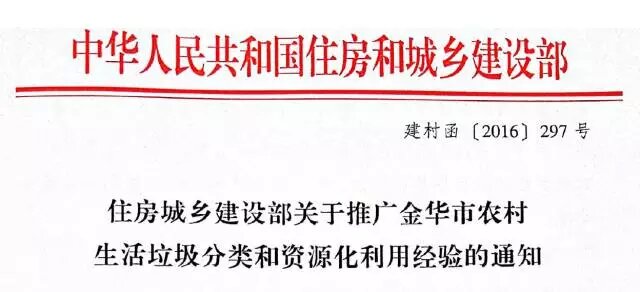 這份長(zhǎng)達(dá)17頁(yè)的的通知中,住建部高度評(píng)價(jià)了2014年以來(lái),金華市積極推進(jìn)農(nóng)村生活垃圾分類(lèi)和資源化利用的探索,要求全國(guó)各省(區(qū)、市)住房城鄉(xiāng)建設(shè)或農(nóng)村生活垃圾治理業(yè)務(wù)主管部門(mén)要認(rèn)真學(xué)習(xí)金華經(jīng)驗(yàn),在本地區(qū)選擇3個(gè)以上代表性縣(市、區(qū)開(kāi)展農(nóng)村生活垃圾分類(lèi)和資源化利用示范,并組織編制實(shí)施方案,國(guó)家住房和城鄉(xiāng)建設(shè)部將組織專(zhuān)家進(jìn)行現(xiàn)場(chǎng)指導(dǎo)和評(píng)估。