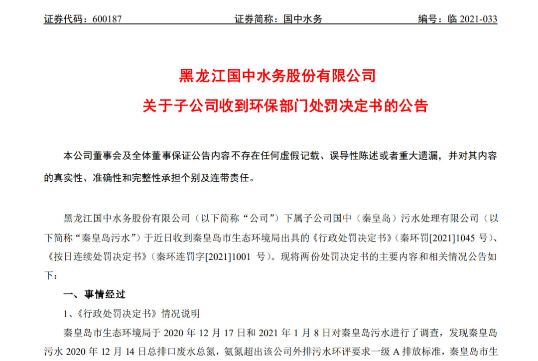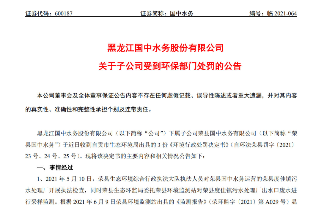 11月25日,國中水務(600187.SH)發(fā)布公告稱,其下屬子公司榮縣國中水務有限公司(下稱“榮縣國中水務”)因為“進水超標導致的出水超標及執(zhí)行標準認定問題”,被罰共計85.70萬元。