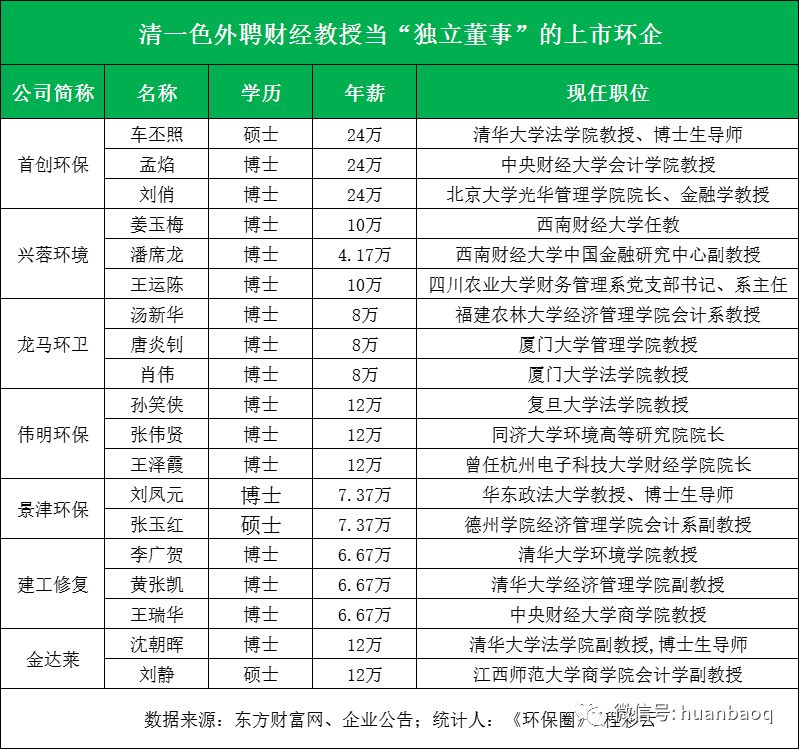 揭秘A股50家上市環(huán)企的132位獨董:簡單了解獨董職責之后,我們回歸環(huán)保行業(yè),談一談A股上市環(huán)企的獨立董事們。筆者查閱資料發(fā)現(xiàn),自從康美案落定后,A股上市環(huán)企中,還真有兩家上市環(huán)企獨董因個人原因提交了辭呈。一位是年薪僅5千元的富春環(huán)保獨立董事林潔,另一位是新三板公司博芳環(huán)保的獨立董事陳麗紅。兩個人都是因為“個人原因”提交的辭呈,巧合的是,辭職的時間都是在康美處罰案落地前后。排除這兩家之外,《環(huán)保圈》發(fā)現(xiàn),A股上市環(huán)企絕大多數(shù)獨立董事都比較淡定,沒有在敏感時期提出辭職。為了讓讀者進一步了解上市環(huán)企獨董的背景,《環(huán)保圈》對A股50家上市環(huán)企中132位獨立董事進行了逐一統(tǒng)計,從而進一步觀察他們年薪、學歷、背景、從業(yè)經(jīng)歷。首先,每家上市環(huán)企外聘的獨立董事數(shù)量幾乎是一樣的,都是3-4個。這跟證監(jiān)會要求有關(guān),“上市公司獨立董事人數(shù)不得少于董事會成員的1/3”。由于環(huán)保上市企業(yè)本身規(guī)模不大,董事會成員大多在10人左右,所以匹配3-4個獨立董事最為合適。其次,從薪資上看,每家企業(yè)外聘獨立董事的工資也是不一樣的。最高的當屬首創(chuàng)環(huán)保,分別給予孟焰、車丕照、劉俏教授年薪24萬/年;其次是國中水務(wù),其獨立董事金忠德薪酬17.86萬元/年;再者還有三峰環(huán)境、清新環(huán)境、興源環(huán)境、偉明環(huán)保、僑銀股份、格林美,中國天楹、金達萊等,這幾家企業(yè)對獨董也非常大方,年薪都在12萬/年以上,平均每月收入1萬元左右。