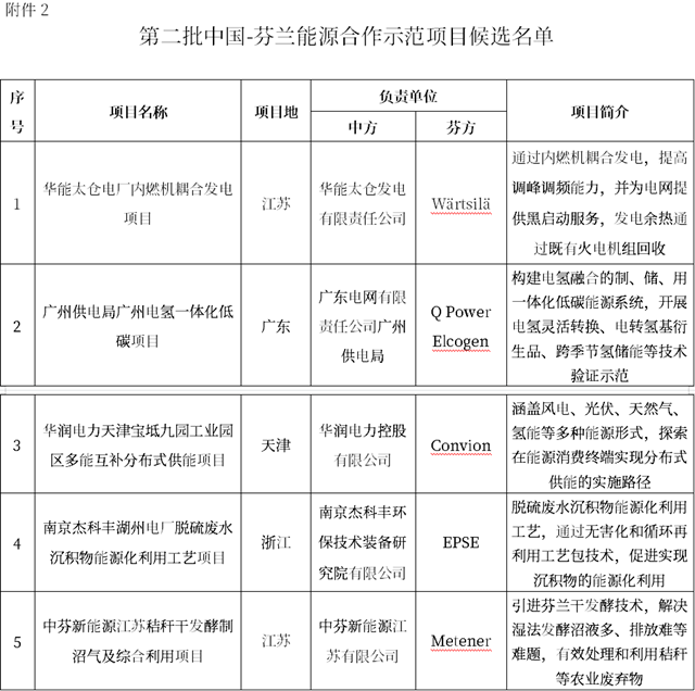 2021年12月20日,國家能源局發(fā)布《關(guān)于首批中國-芬蘭能源合作示范項目更新名單以及第二批示范項目候選名單的公示》。