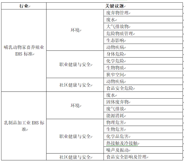 在聯(lián)合國(guó)可持續(xù)發(fā)展目標(biāo)及各個(gè)國(guó)際組織出臺(tái)的可持續(xù)議題基礎(chǔ)之上,目前國(guó)際上也形成了行業(yè)導(dǎo)向的可持續(xù)發(fā)展標(biāo)準(zhǔn)。其中,由世界銀行集團(tuán)國(guó)際金融公司制定的《環(huán)境、健康與安全指南(EHS)》中就有針對(duì)乳制品行業(yè)的養(yǎng)殖端與加工端,在充分考慮行業(yè)特色的基礎(chǔ)上分別形成了兩套指標(biāo),《哺乳動(dòng)物家畜養(yǎng)殖業(yè)環(huán)境、健康與安全指南》與《乳制品加工業(yè)環(huán)境、健康與安全指南》,重點(diǎn)關(guān)注行業(yè)在環(huán)境、職業(yè)健康與安全、社區(qū)健康與安全三大領(lǐng)域下的可持續(xù)發(fā)展。對(duì)于乳制品行業(yè)的養(yǎng)殖端來(lái)說(shuō),應(yīng)重點(diǎn)關(guān)注環(huán)境層面的表現(xiàn),包括養(yǎng)殖過(guò)程中的廢棄物、廢水處理、溫室氣體排放情況、潛在生態(tài)影響、動(dòng)物疾病等方面;對(duì)于加工端來(lái)說(shuō),應(yīng)重點(diǎn)關(guān)注加工制造過(guò)程中的能耗情況、廢氣排放情況、固體廢棄物處理,以及生產(chǎn)安全情況等方面。