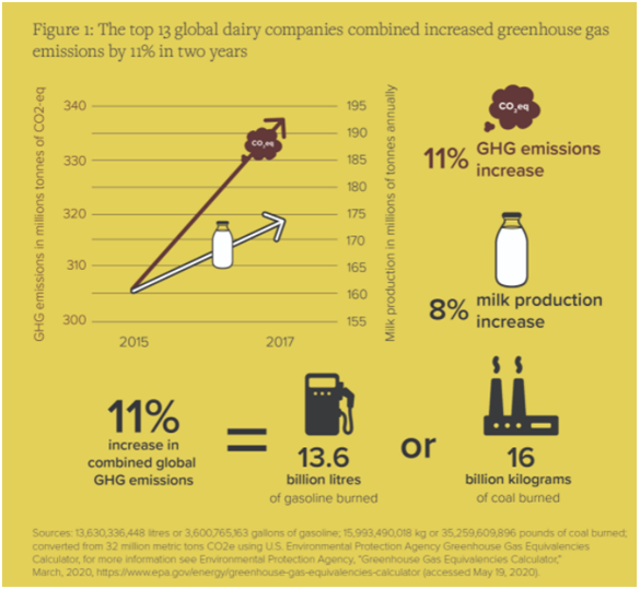 乳制品指的是使用牛乳或羊乳及其加工制品為主要原料,加入或不加入適量的維生素、礦物質(zhì)和其他輔料,使用法律法規(guī)及標(biāo)準(zhǔn)規(guī)定所要求的條件,經(jīng)加工制成的各種食品。乳制品包括液體乳(巴氏殺菌乳、滅菌乳、調(diào)制乳、發(fā)酵乳);乳粉(全脂乳粉、脫脂乳粉、部分脫脂乳粉、調(diào)制乳粉、牛初乳粉);其他乳制品(等)。國(guó)際農(nóng)業(yè)和貿(mào)易政策研究所(IATP)2020年發(fā)布的《Milking the Planet》報(bào)告指出,乳制品行業(yè)是全球溫室氣體排放量上升的主要原因之一。報(bào)告中提到2017年全球十三大乳制品公司產(chǎn)生了超過(guò)3.38億噸的溫室氣體,已經(jīng)超過(guò)了兩個(gè)全球最大的化石燃料排放企業(yè)總部位于澳大利亞的礦業(yè)、石油和天然氣巨頭(BHP)和總部位于美國(guó)的石油公司(ConocoPhillips)。盡管各國(guó)政府在2015年簽署了《巴黎協(xié)定》,致力于控制碳排放量,但2015-2017年這13家公司的總排放量仍增長(zhǎng)了11%,增加的3230萬(wàn)噸溫室氣體相當(dāng)于一年內(nèi)行駛690萬(wàn)輛乘用車造成的污染。