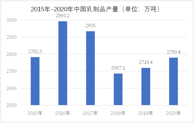 圖2:2015-2020年我國(guó)乳制品產(chǎn)量