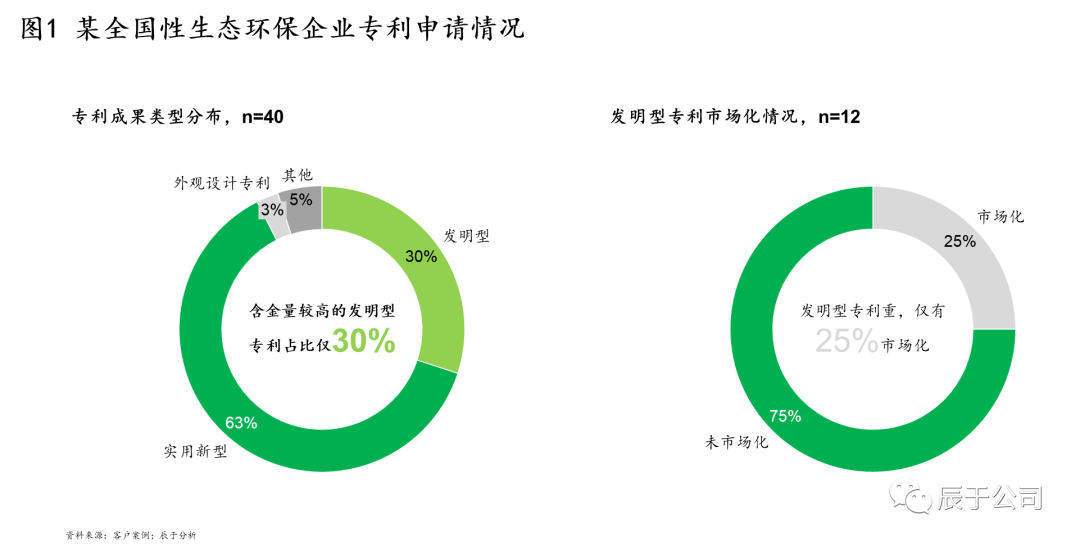 以我們服務(wù)過(guò)的某全國(guó)性生態(tài)環(huán)保企業(yè)為例,盡管營(yíng)業(yè)收入已近70億元,但當(dāng)年的研發(fā)投入不足1000萬(wàn)元,專利申請(qǐng)數(shù)區(qū)區(qū)40件,且63%的為實(shí)用新型專利,含金量較高的發(fā)明型專利僅占30%,其中又只有25%的進(jìn)行了商業(yè)應(yīng)用(見(jiàn)圖1)。