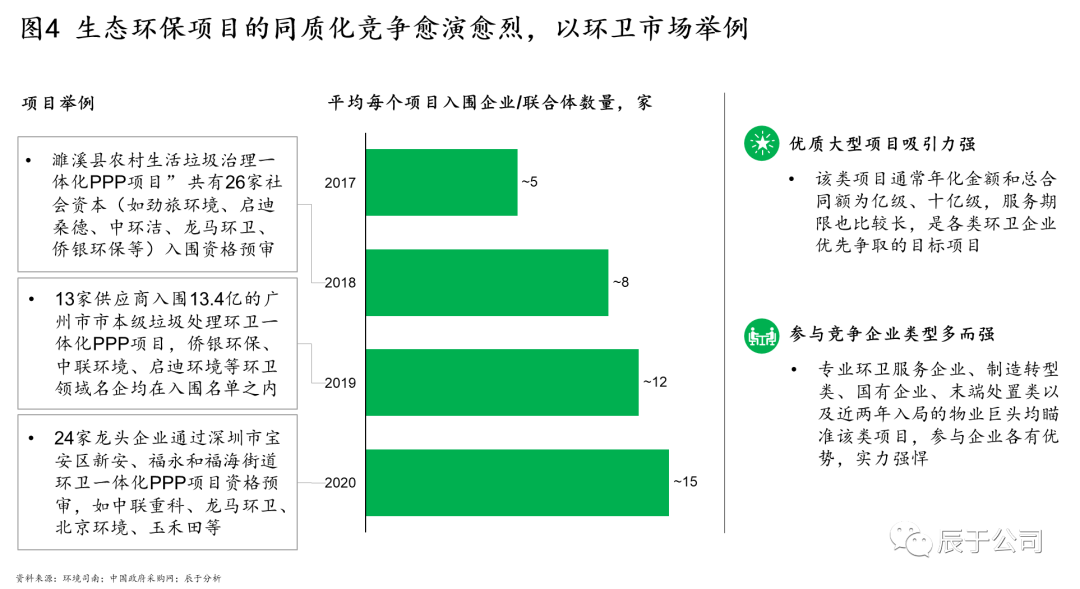 這樣帶來(lái)的直接后果就是同質(zhì)化競(jìng)爭(zhēng)愈演愈烈,價(jià)格戰(zhàn)時(shí)有發(fā)生,不僅影響企業(yè)的盈利水平,也對(duì)后期的運(yùn)營(yíng)帶來(lái)隱患。由于缺乏有門檻的技術(shù)壁壘,一些環(huán)保項(xiàng)目的招標(biāo)活動(dòng)動(dòng)輒十幾家甚至數(shù)十家企業(yè)參加(見(jiàn)圖4),而針對(duì)一些技術(shù)難度大的項(xiàng)目,要么無(wú)人問(wèn)津不敢接手,要么接手了之后最終陷于無(wú)計(jì)可施的尷尬境地。