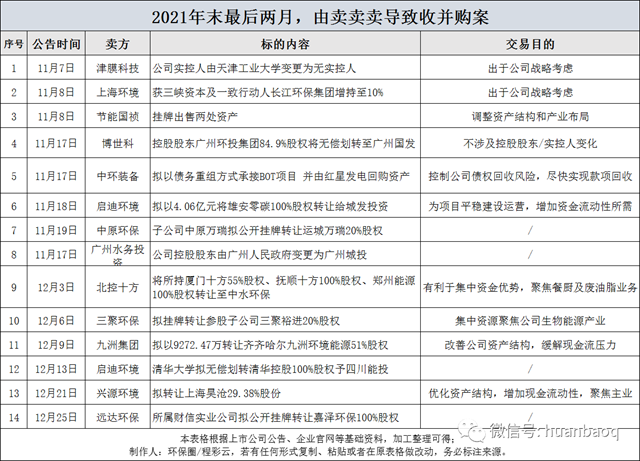 但更多的是,不少我們熟知的上市環(huán)企為了降低負債、保存實力“過冬”、緩解資金流動壓力,開始“賣賣賣”,小至某個污水處理廠、垃圾焚燒廠股權出售,大至整個公司實控人發(fā)生變更,年末最后兩月累計發(fā)生的26起并購交易案,其中“賣賣賣”占據(jù)一半,高達14起。