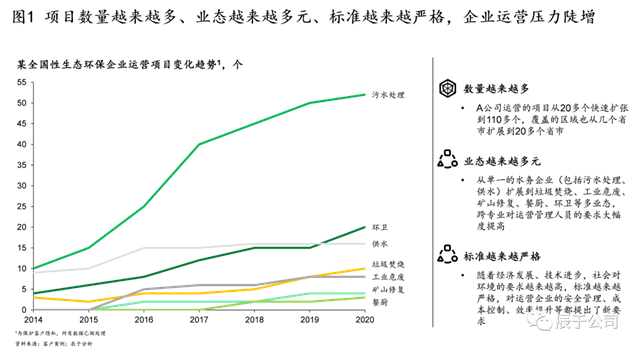 近幾年來,一批環(huán)保企業(yè)蓬勃發(fā)展,規(guī)模迅速擴張,他們所持有的項目數(shù)量越來越多,業(yè)態(tài)越來越多元。以我們服務(wù)的某全國性生態(tài)環(huán)保企業(yè)為例,2014-2020年間,運營項目從20多個增加到100多個,覆蓋區(qū)域從8個省市擴張到20多個,業(yè)態(tài)也從單一的污水、供水,延伸到垃圾焚燒、工業(yè)危廢、礦山修復(fù)、餐廚、環(huán)衛(wèi)等“水、固、生態(tài)修復(fù)”協(xié)同發(fā)展(見圖1)。
