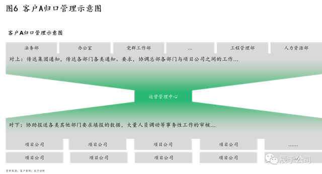 我們也看到,對項目公司的管理,一些企業(yè)簡單的劃分為建設(shè)階段的項目公司由工程管理部門統(tǒng)籌管理、運營階段的則由運營管理部門統(tǒng)籌管理,對上“傳達集團通知,傳達各部門各類通知、要求,協(xié)調(diào)總部各部門與項目公司之間的工作”,對下“協(xié)助報送各類其他部門要求填報的數(shù)據(jù),大量人員調(diào)動等事務(wù)性工作的審核”等,原本簡單的總部-項目公司兩級架構(gòu),演變成總部其他部門——總部(工程)運營管理部門——(工程期)運營期項目公司“漏斗型”三級架構(gòu) (見圖6)。