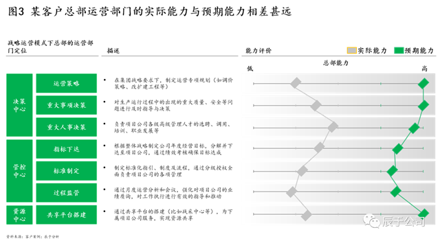 造成以上問題的根本原因是管理沒有跟著業(yè)務(wù)走,各級主體的角色定位沒有跟著公司發(fā)展而變化,該總部管的沒有管好,不需總部管的管太多。領(lǐng)先實踐表明,隨著一些企業(yè)的業(yè)務(wù)多元發(fā)展,總部定位也需要逐步從運營管控往戰(zhàn)略運營管控轉(zhuǎn)型,做好“決策、管控、資源共享”等中心定位,但有些企業(yè)的管理變革顯然沒有緊隨其后(見圖3)。