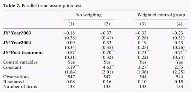 文章中的表3顯示了構(gòu)建合成江陰市的其他城市的貢獻(xiàn)權(quán)重。很明顯,常熟和吳江提供了最有用的信息,而邳州、宜興和東臺(tái)也做出了一定的貢獻(xiàn)。因此,在公司層面的分析中,作者將這五個(gè)城市中的公司作為DiD分析的對(duì)照組。