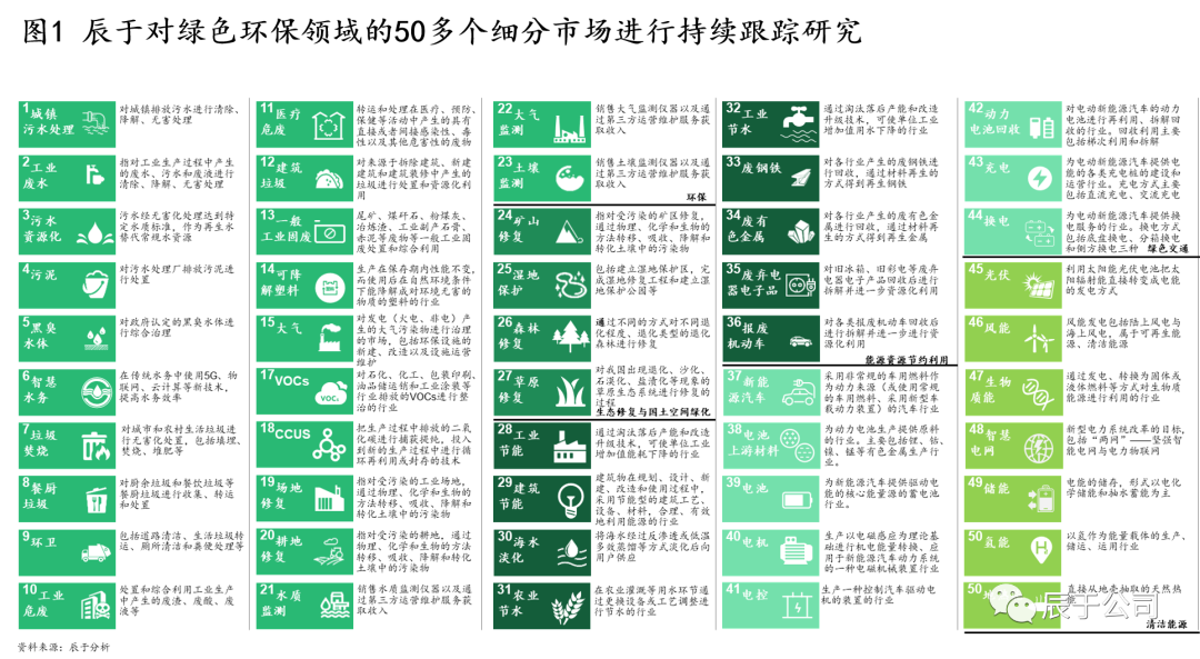作為一家聚焦于綠色發(fā)展領(lǐng)域的專業(yè)咨詢機(jī)構(gòu),結(jié)合以往項(xiàng)目經(jīng)驗(yàn)以及業(yè)內(nèi)習(xí)慣,辰于對(duì)綠色環(huán)保行業(yè)范圍進(jìn)行了明確劃分,目前已經(jīng)持續(xù)跟蹤50多個(gè)細(xì)分領(lǐng)域(見圖1)。有意思的一點(diǎn)是,過去的環(huán)保行業(yè)范圍一般是指包含供水、各類污染物末端處置和治理以及環(huán)境監(jiān)測(cè)在內(nèi)的傳統(tǒng)環(huán)保領(lǐng)域,雙碳戰(zhàn)略提出后,當(dāng)人們談到“環(huán)保”時(shí),更多是指“綠色環(huán)保”的概念,節(jié)能、清潔能源、雙碳業(yè)務(wù)等行業(yè)也被納入。