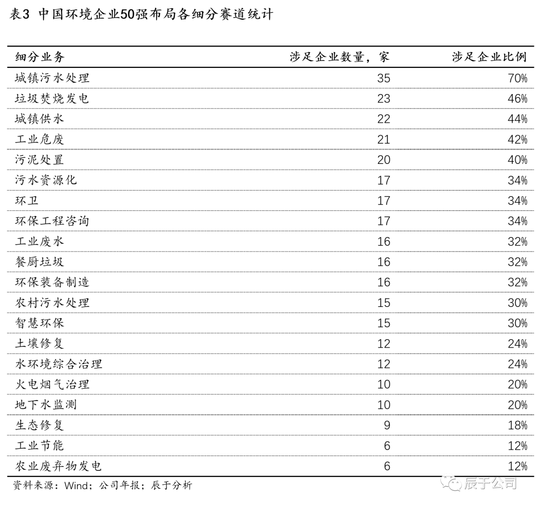 更細(xì)分去看,城鎮(zhèn)污水處理、垃圾焚燒發(fā)電、城鎮(zhèn)供水、工業(yè)危廢等是中國環(huán)境企業(yè)50強(qiáng)布局最多的細(xì)分領(lǐng)域(見表3),這些領(lǐng)域基本都是規(guī)模上千億甚至數(shù)千億的市場(chǎng),“盤子”足夠大,商業(yè)模式穩(wěn)定,是環(huán)境強(qiáng)企必爭之地。