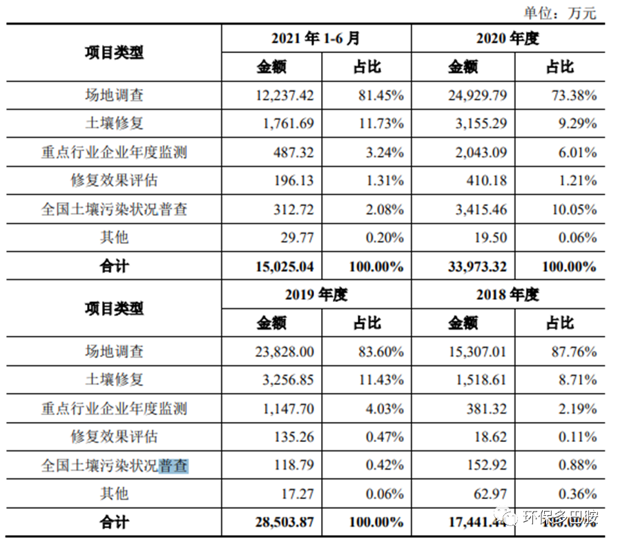 “報告期各期(2018-2021H1),公司土壤和地下水檢測業(yè)務收入分別為 17,441.44 萬元、28,503.87 萬元、33,973.32 萬元、15,025.04 萬元,占公司主營業(yè)務收入的比重分 別為 98.15%、95.69%、94.73%、91.81%。”