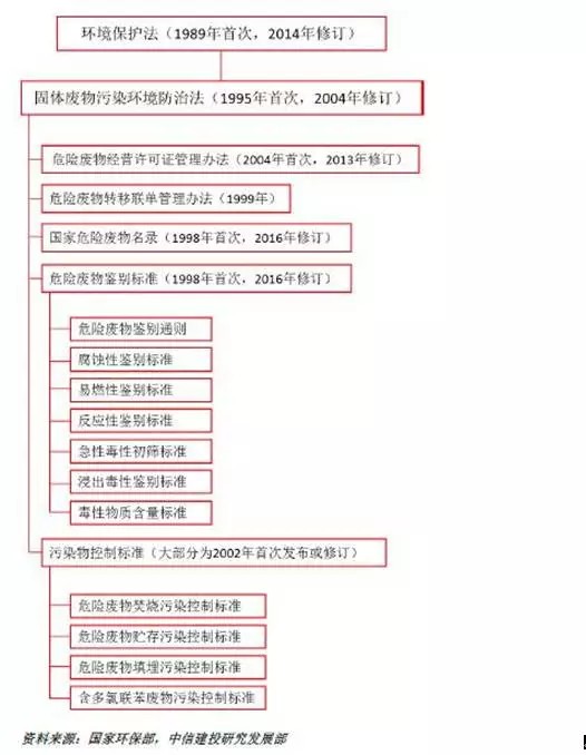 與危廢管理相關(guān)的法律包括:《環(huán)保法》、《固體廢物污染環(huán)境防治法》、《可再生能源法》、《節(jié)約能源法》、《循環(huán)經(jīng)濟(jì)促進(jìn)法》、《清潔生產(chǎn)促進(jìn)法》。除《環(huán)保法》和《固體廢物污染環(huán)境防治法》外其他法律都是在2004年后頒布,《環(huán)保法》修訂已于2014年4月完成,2015年起執(zhí)行。