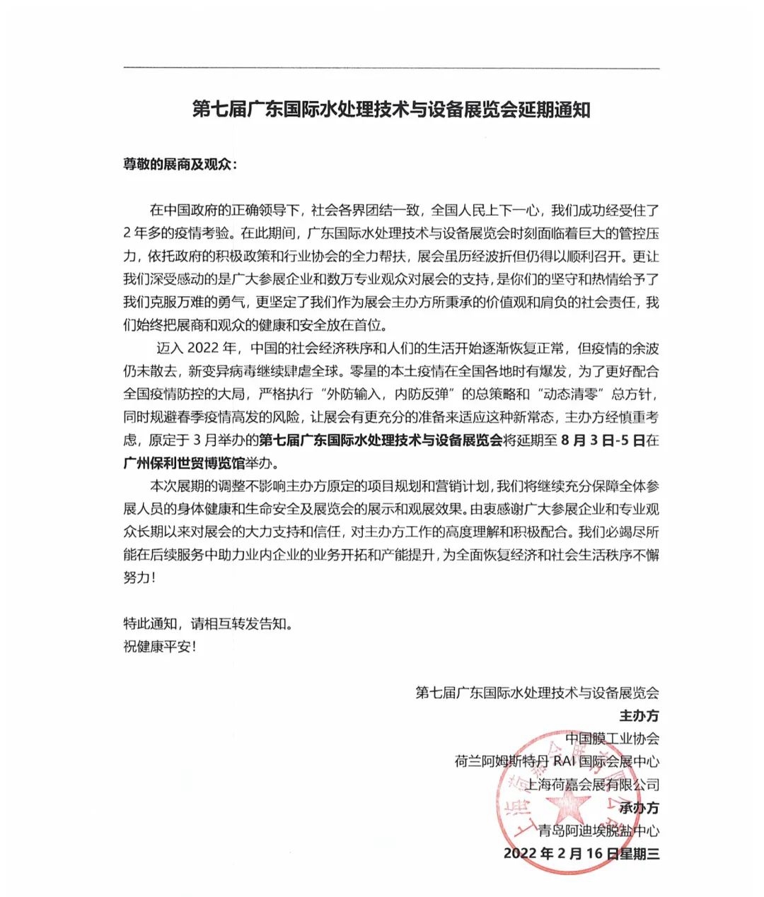 原定于2022年3月31-4月2日在廣州保利世貿(mào)博覽館舉辦的第七屆廣東水展將延期至2022年8月3日-5日。場(chǎng)館地址不變,特作出以下公告,對(duì)于延期給您帶來(lái)的不便深表歉意。