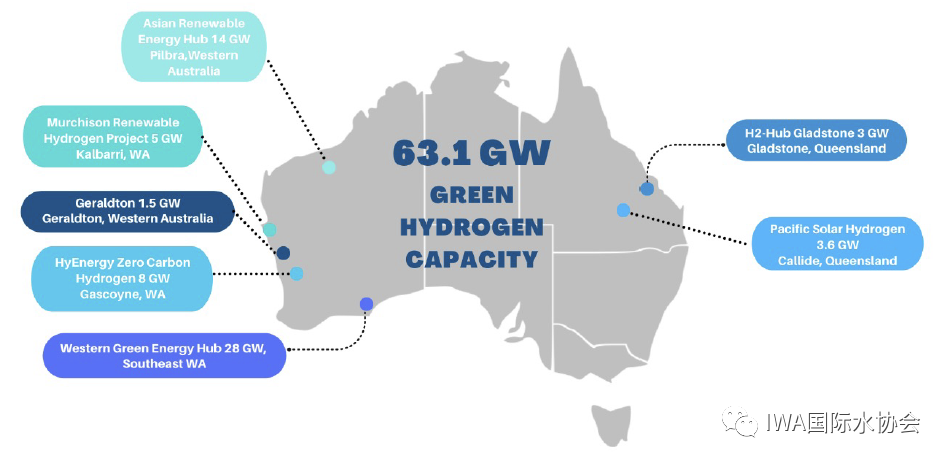 如下圖所示,澳洲計劃在東西海岸打造7個吉瓦級(GWh)的綠氫項目。此外,各地的污水廠已經(jīng)有實際的項目在測試或運行中。