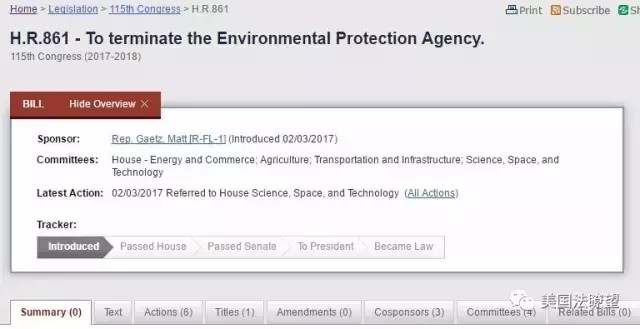 2017-02-14 中國(guó)環(huán)境新聞2017年2月3日,美國(guó)國(guó)會(huì)公布了一份來(lái)自國(guó)會(huì)參議員的提案,名稱為《撤銷環(huán)境保護(hù)局》(To terminate the Environmental Protection Agency),提議在2018年底撤銷國(guó)家環(huán)境保護(hù)局。What ? 在環(huán)境議題已經(jīng)在全世界廣受關(guān)注的時(shí)候,居然會(huì)有人提議撤銷環(huán)保局!美國(guó)國(guó)會(huì)網(wǎng)站公布的“關(guān)于撤銷環(huán)境保護(hù)局議案”這份“撤銷環(huán)境保護(hù)局”的議案由來(lái)自佛羅里達(dá)州第一選區(qū)的參議員馬特?蓋茨(Matt Gaetz)牽頭提出,該議案同時(shí)有另外三名共和黨議員聯(lián)名附屬簽名提出。