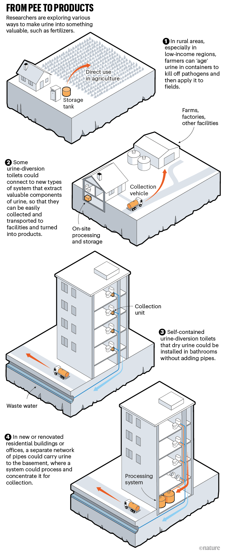 編者按:正當(dāng)國(guó)人大張旗鼓倡導(dǎo)并實(shí)施農(nóng)村污水處理的時(shí)候,國(guó)際上正處于尿液分離并加以利用的“星星之火可以燎原”態(tài)勢(shì)下。其實(shí),糞尿返田乃我們老祖宗創(chuàng)造的原生態(tài)文明!不幸的是,我們正在放棄或撇棄這種古老的原生態(tài)方式。城市現(xiàn)代排水系統(tǒng)木已成舟,推倒重來(lái)的經(jīng)濟(jì)代價(jià)太大!但是,處于生態(tài)環(huán)保十字路口的農(nóng)村污水處理卻可以選擇性保留原生態(tài)農(nóng)作方式。遺憾的是,我們的選擇再次出現(xiàn)失誤。如果我們完全撇棄糞尿返田的原生態(tài)方式,生態(tài)文明建設(shè)將成為空話,因?yàn)檫@是迄今為止所能確認(rèn)的人類對(duì)生態(tài)幾乎唯一的貢獻(xiàn)!2022年2月9日英國(guó)Nature(自然)雜志發(fā)表了一個(gè)News Feature (新聞特寫(xiě)),就尿液分離與利用全球研究與應(yīng)用現(xiàn)狀進(jìn)行了專述。我們將整理后中文稿以公眾號(hào)方式推出,以引起國(guó)人的關(guān)注,以免我們?cè)谖鬯幚砼c利用方面不斷步西方國(guó)家之后塵。
