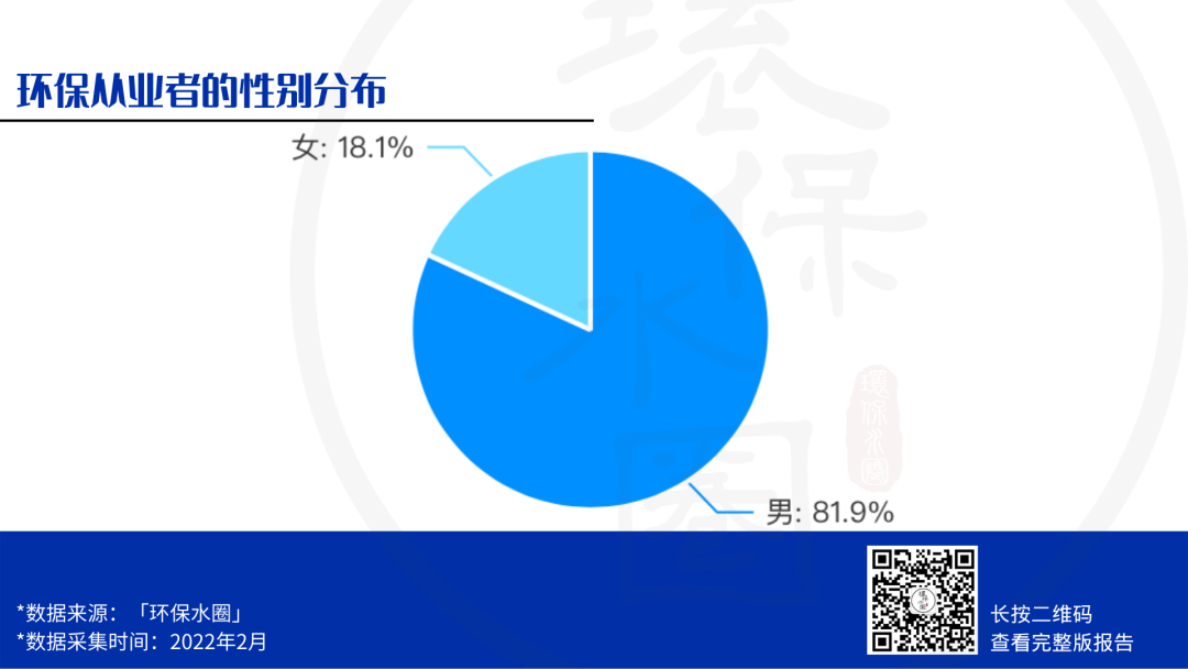 本次調(diào)查發(fā)現(xiàn),環(huán)保從業(yè)群體中男女比例為81.9%:18.1%,接近5:1,與我們在2021年調(diào)查的結(jié)果相比,女性環(huán)保從業(yè)者的比例提升了1.5%~2%,這是一個非??上驳默F(xiàn)象,希望越來越多的小仙女兒們能加入環(huán)保的隊伍中來,男女搭配,干活不累!