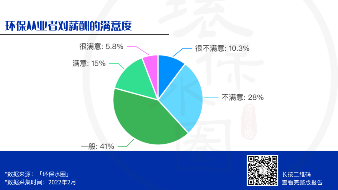 雖然相對于其他行業(yè),環(huán)保行業(yè)的整體收入偏低,但此次調(diào)研可以看出環(huán)保人對自己的工作現(xiàn)狀都比較客觀,沒有抱很大的負面情緒,約61.7%的從業(yè)者對當(dāng)前薪資的態(tài)度為一般、滿意。