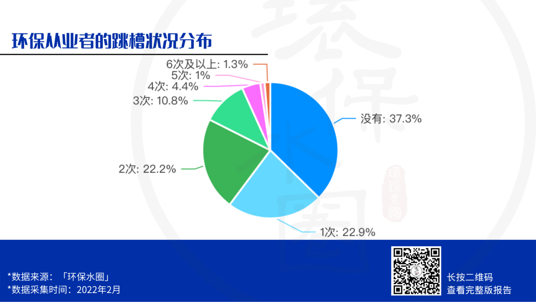 在工作上,工齡8-10年的環(huán)保從業(yè)者占比最少,此類群體往往有經(jīng)驗、有能力,但卻選擇半道棄坑,一方面源于行業(yè)內(nèi)部依然普遍存在著能力與收入不相匹配的現(xiàn)象。而對于跳槽,62.7%的環(huán)保人都有過跳槽經(jīng)歷,且跳槽過后的薪資相對提升。