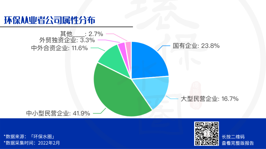 從數(shù)據(jù)中我們還可以看到,有23.8%的環(huán)保人工作在國企,有14.9%的環(huán)保人工作在中外合資或外商獨資的企業(yè)中,整體占比并不高。