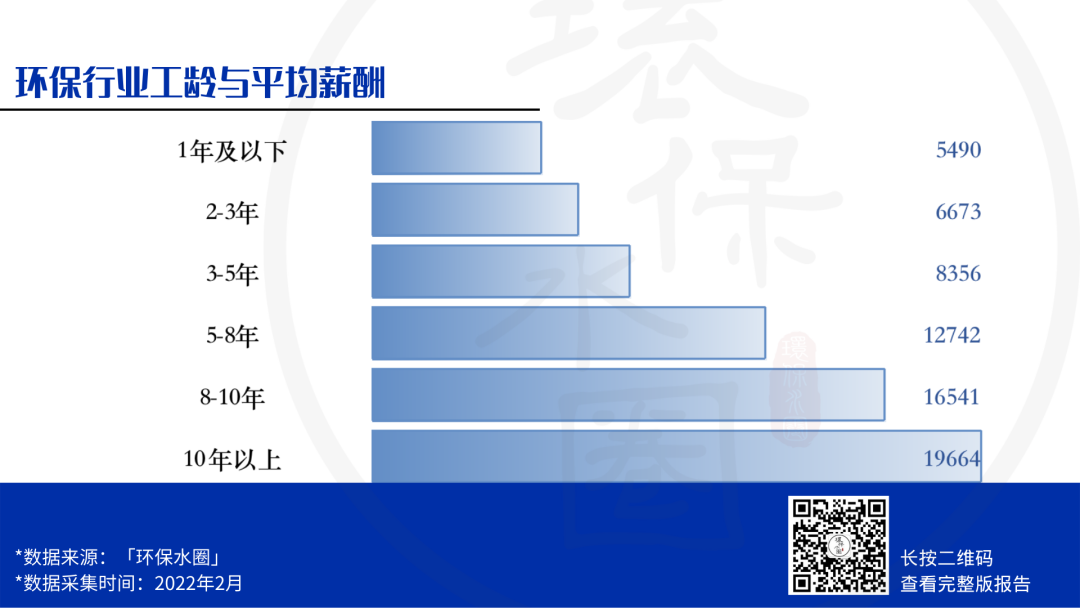 調(diào)研數(shù)據(jù)顯示,環(huán)保人薪資與工齡增長呈正比,越老越吃香是鐵律。 5-8年的環(huán)保人平均薪資超過10000元,10年以上,稅前月薪平均接近20000元。但需要說明的是,工齡到達8年以后,薪資增幅放緩。