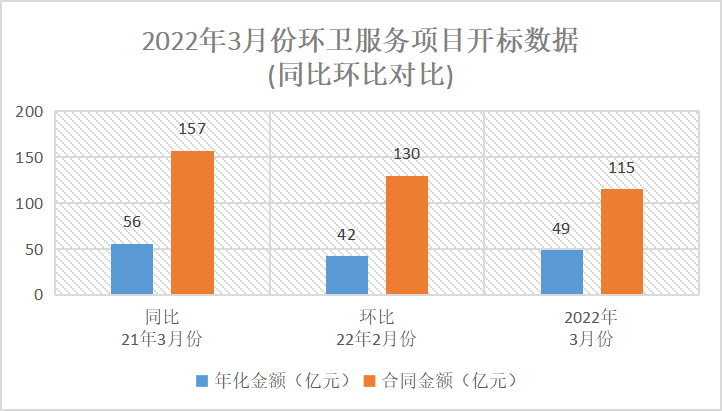 受疫情影響,三月份全國范圍環(huán)衛(wèi)服務(wù)項(xiàng)目大面積暫停招標(biāo)或推遲開標(biāo),與去年同期(同比)及今年二月份(環(huán)比)相比,環(huán)衛(wèi)服務(wù)項(xiàng)目成交年化額及合同額均出現(xiàn)不同程度下降。