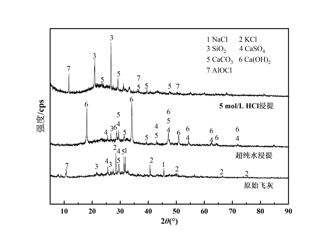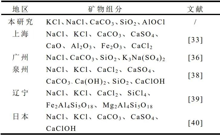 與不同地區(qū)飛灰礦物相組分對(duì)比,由表3可知,不同地區(qū)飛灰均含有碳酸鹽和硅酸鹽,且含有NaCl、KCl等可溶性氯鹽,Na、K元素來源于餐飲中食鹽等調(diào)味料的添加,高含量Cl-來源于爐排爐高溫焚燒下無機(jī)氯鹽的揮發(fā)以及垃圾成分中的廚余垃圾、塑料制品。相較于其他地區(qū),本研究還檢測到不溶氯AlOCl組分,可能是由于飛灰中Al2O3與焚燒煙氣中的酸性氣體反應(yīng)生成。