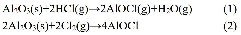 經(jīng)純水和鹽酸浸出后,飛灰中KCl和NaCl的衍射峰基本消失,表明可溶性氯鹽被脫除。飛灰經(jīng)純水浸出,出現(xiàn)明顯的水溶性較低的Ca(OH)2(ICDD 01-078-0315)衍射峰,可能是CaO等堿性氧化物與水反應(yīng)所致。鹽酸浸出后飛灰中的主要礦物相為CaCO3、SiO2(ICDD 01-075-0443)和AlOCl。大量溶解性鹽類被脫除后,性質(zhì)穩(wěn)定的SiO2衍射峰更明顯。同時(shí),原灰中AlOCl物相的衍射特征峰明顯增強(qiáng),結(jié)果表明原灰中包含不可溶氯鹽,可能是飛灰在高溫焚燒過程中產(chǎn)生的,見式(1)、(2)。