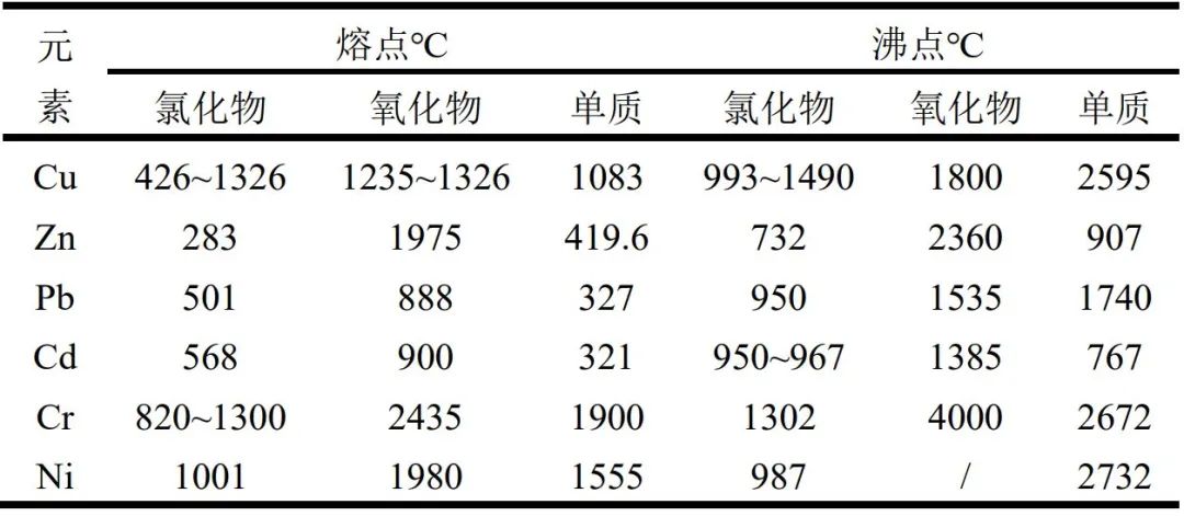 表2 飛灰中重金屬不同存在形態(tài)及其熔沸點(diǎn)