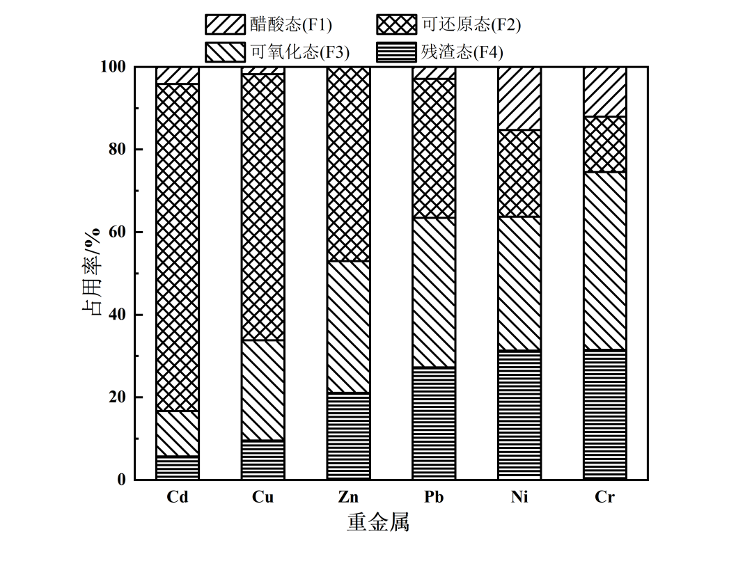 重金屬的生物有效性及潛在遷移性不僅與其總量有關(guān),還與其在飛灰中的賦存形態(tài)密切相關(guān),按照BCR分級(jí)提取法對(duì)焚燒飛灰中不同形態(tài)重金屬進(jìn)行提取測定。BCR四步連續(xù)提取法將重金屬分為F1態(tài),主要含有水溶態(tài)、可交換態(tài)和碳酸鹽結(jié)合態(tài),在中性或弱酸性條件下易浸出;F2態(tài)主要是鐵錳氧化物結(jié)合態(tài),高活性的鐵錳氧化物比表面積大,對(duì)金屬離子有較大吸附容量,在還原條件下較易釋放;F3態(tài)包括有機(jī)物與硫化物結(jié)合態(tài),這一過程提取出來的重金屬,是被有機(jī)物或硫化物絡(luò)合的部分,在強(qiáng)氧化條件下可分解;F4態(tài)中元素主要與硅酸鹽礦物組合,在自然條件下性能穩(wěn)定,環(huán)境生態(tài)風(fēng)險(xiǎn)較小。本研究飛灰中重金屬的不同賦存形態(tài)所占百分比如圖1所示。