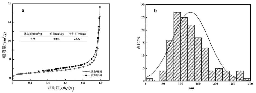 圖4 原始飛灰吸脫附曲線(a)和粒徑正態(tài)分布(b)