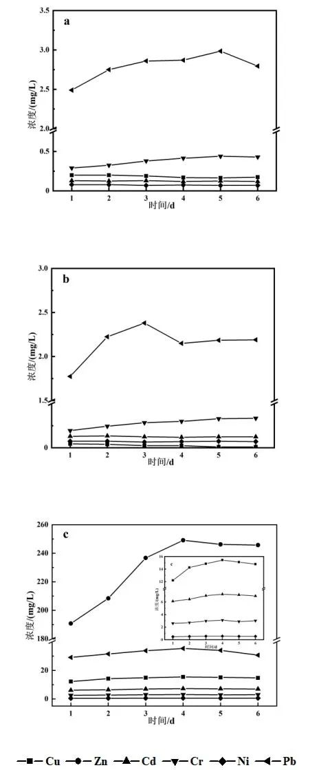 圖6 不同浸提劑下飛灰中重金屬的長時(shí)間溶出(a: 1#超純水;b: 2#醋酸;c: 3# 5 mol/L HCl)