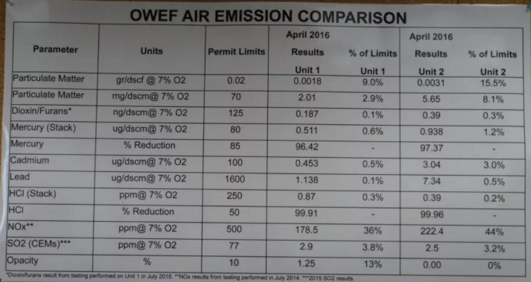 會議之后,我們開始陸續(xù)走訪工廠,第一個是美國明尼阿波利斯—Olmsted焚燒廠,該廠為2x100t/d+1x200t/d的規(guī)模,煙氣工藝采用的是固定噴霧法+布袋除塵器。全廠排放情況尚可,具體如下: