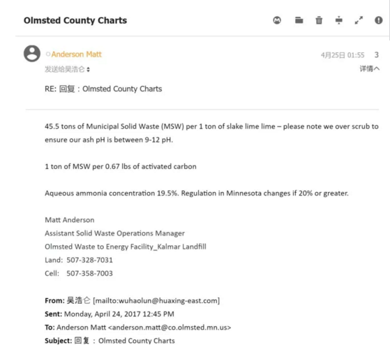 參觀的同時,我們交流了一下大致的排放指標,由于時間久了具體排放限值數據記不清了,但印象中其排放指標一般,甚至高于國內現行的18485標準?;貒笪也殚喠讼嚓P資料,發(fā)現明尼阿波利斯的地方標準有所提高。其依據是我查閱了一個Olmsted焚燒廠3號線的環(huán)評報告,并注意到Olmsted的1.2號線的排放標準明顯寬于3號線的排放標準,有興趣的同志可以往上翻幾頁看看Olmsted廠的排放標準。