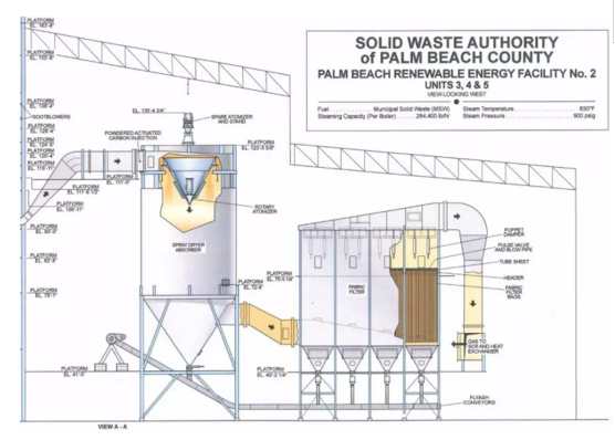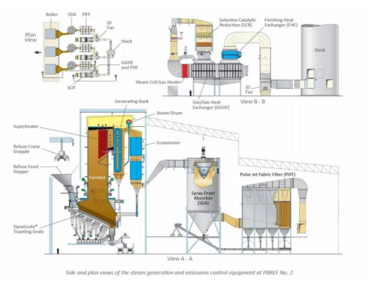 接下來說重點,介紹一下這個焚燒廠。全廠為3x1000t/d的偉倫爐排,煙氣工藝采用了SDA+布袋+GGH+SGH+SCR。該廠位于特朗普老家,而且離得不遠,是目前美國最先進的焚燒廠,也是第一座采用SCR工藝的焚燒廠,2012年開始建設至2015年投入商業(yè)運行,隸屬于佛羅里達州海岸縣固廢管理局。