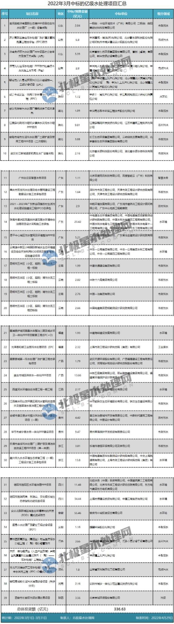 據(jù)統(tǒng)計,2022年3月開標億級水處理項目39個(含部分預中標,不含上個月已統(tǒng)計的預中標,不含供水),涉及16大省份,總投資額336.63億元。