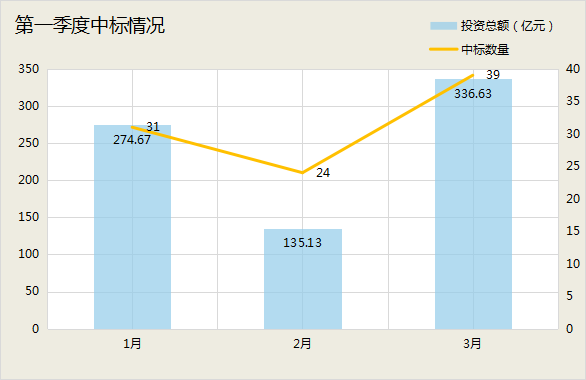 第一季度,開標的億級水處理項目共94個,涉及總投資746億元,其中3月份的勢頭最盛。