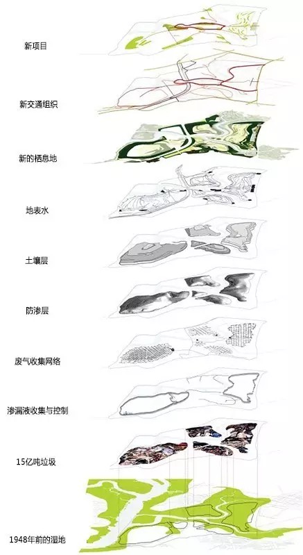 環(huán)境修復(fù)與垃圾防滲是弗萊士河公園改造初期的關(guān)鍵任務(wù),其中運(yùn)用了多層覆蓋技術(shù),收集廢棄物產(chǎn)生的氣體、滲漏液的系統(tǒng)和水質(zhì)檢測(cè)系統(tǒng)(圖7,圖8)。場(chǎng)地生態(tài)修復(fù)需達(dá)到嚴(yán)格的標(biāo)準(zhǔn)后方允許啟動(dòng)各類(lèi)建設(shè)項(xiàng)目。